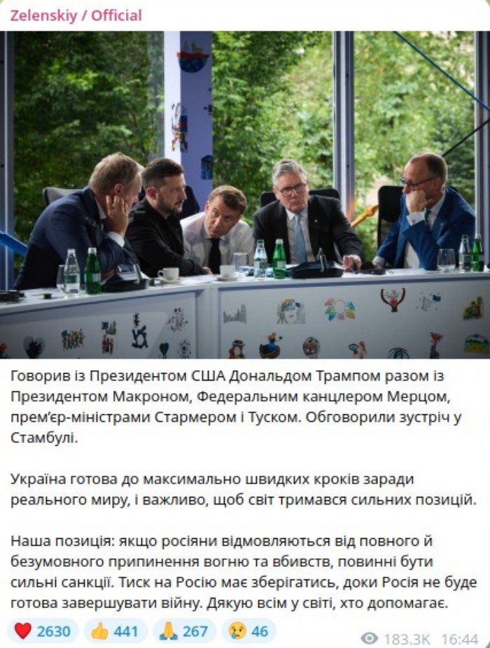Говорив із Президентом США Дональдом Трампом разом із Президентом Макроном, Федеральним канцлером Мерцом, прем'єр-міністрами Стармером і Туском. Обговорили зустріч у Стамбулі, — зазначив він.