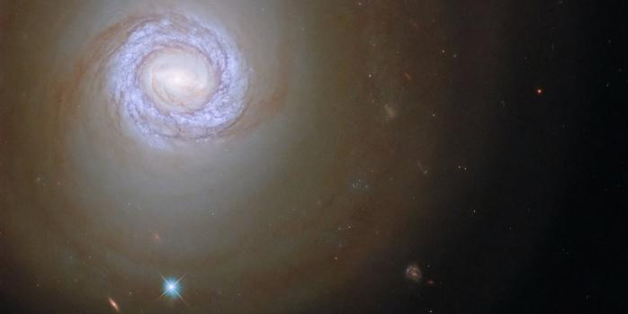 - червоніша видовжена пляма поруч — це ще одна галактика, що лежить далеко за межами зображеної тут.