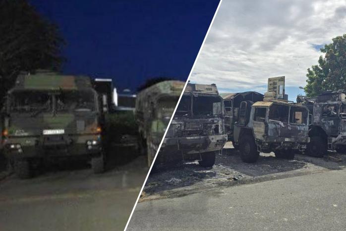На відео горить щонайменше шість вантажівок Rheinmetall MAN різних модифікацій. Однак на їх бортах добре помітно характерні хрести Бундесверу та німецькі автомобільні номери, що свідчить про їх приналежність до ЗС Німеччини.