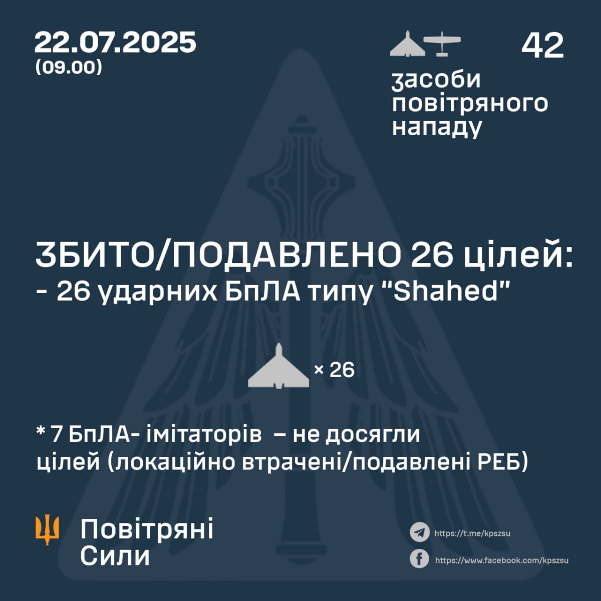 У ніч на 22 липня окупанти запустили 42 ударних БпЛА типу Shahed і безпілотників-імітаторів різних типів із Приморсько-Ахтарська в росії та Чауди й Гвардійського в окупованому Криму. Про це Повітряні сили Збройних сил України повідомили в Telegram.