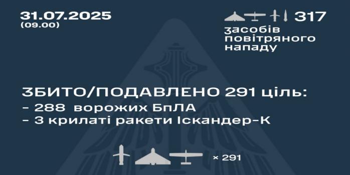 - протиповітряною обороною збито/подавлено РЕБ 291 засіб повітряного нападу противника — 288 ударних БПЛА та три крилаті ракети «Іскандер-К»;