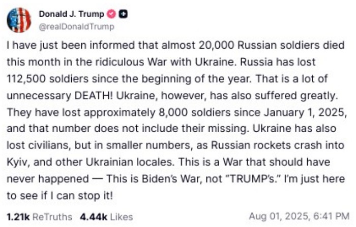 Трамп наголошує, що Україна також сильно постраждала й з 1 січня 2025 року втратила приблизно 8 тис. солдатів, і це число не включає зниклих безвісти.