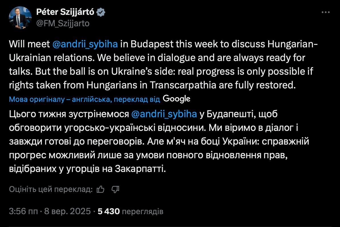 Зустріч очільників українського та угорського зовнішньополітичних відомств очікується на цьому тижні, між 8 та 14 вересня. Сибіга та Сіярто говоритимуть в Будапешті про угорсько-українські відносини. Про це глава МЗС Угорщини повідомив у соцмережах.