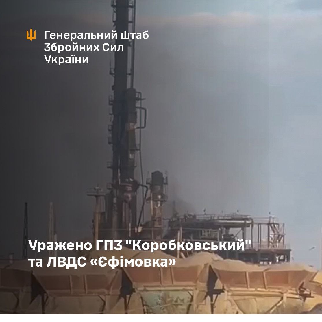 У ніч на 9 жовтня було уражено Коробковський газопереробний завод та лінійно-виробнича диспетчерська станцію «Єфімовка». Про це Генеральний штаб Збройних сил України повідомив у Telegram.