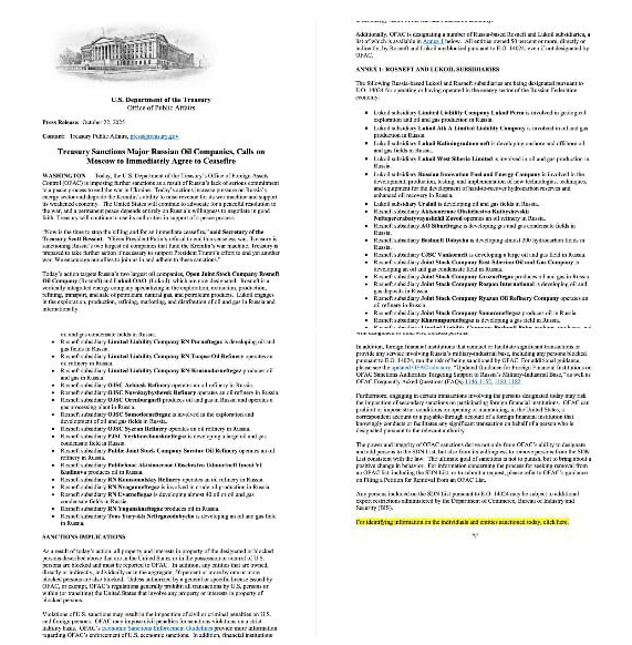У санкційний список потрапили нафтові гіганти «Роснефть» та «Лукойл», а також низка їхніх дочірніх компаній, що займаються видобутком, переробкою та продажем нафти і газу на території Росії. Обмеження спрямовані на тиск на російський енергетичний сектор та обмеження доходів, які Кремль використовує для фінансування війни і підтримки економіки. Про це повідомило Міністерство фінансів США.