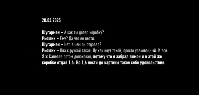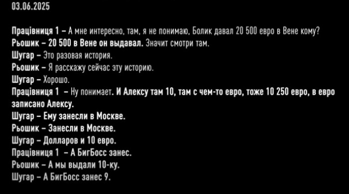 Так, під час однієї з розмов, яка сталася 20 березня, Рьошик у розмові з Шугарменом поскаржився на вагу коробки із валютою, яку йому довелося нести: