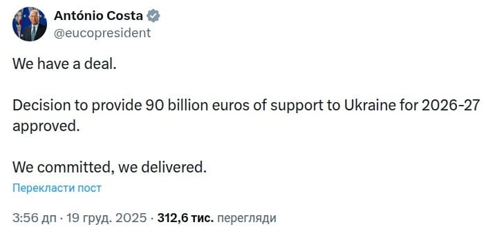 Ми досягли угоди. Ухвалене рішення про надання Україні допомоги в розмірі 90 мільярдів євро на 2026−27 роки. Ми взяли на себе зобов’язання і виконали його, — зазначив він.