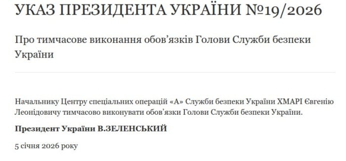 Відповідний указ № 19/2026 «Про тимчасове виконання обов’язків Голови Служби безпеки України» сьогодні, 5 січня, опубліковано на сайті Офісу президента.
