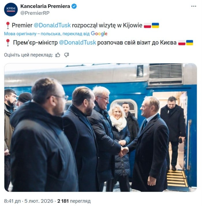 Про це сьогодні, 5 лютого, вранці на своїй сторінці в соціальній мережі X повідомила канцелярія очільника уряду Польщі.