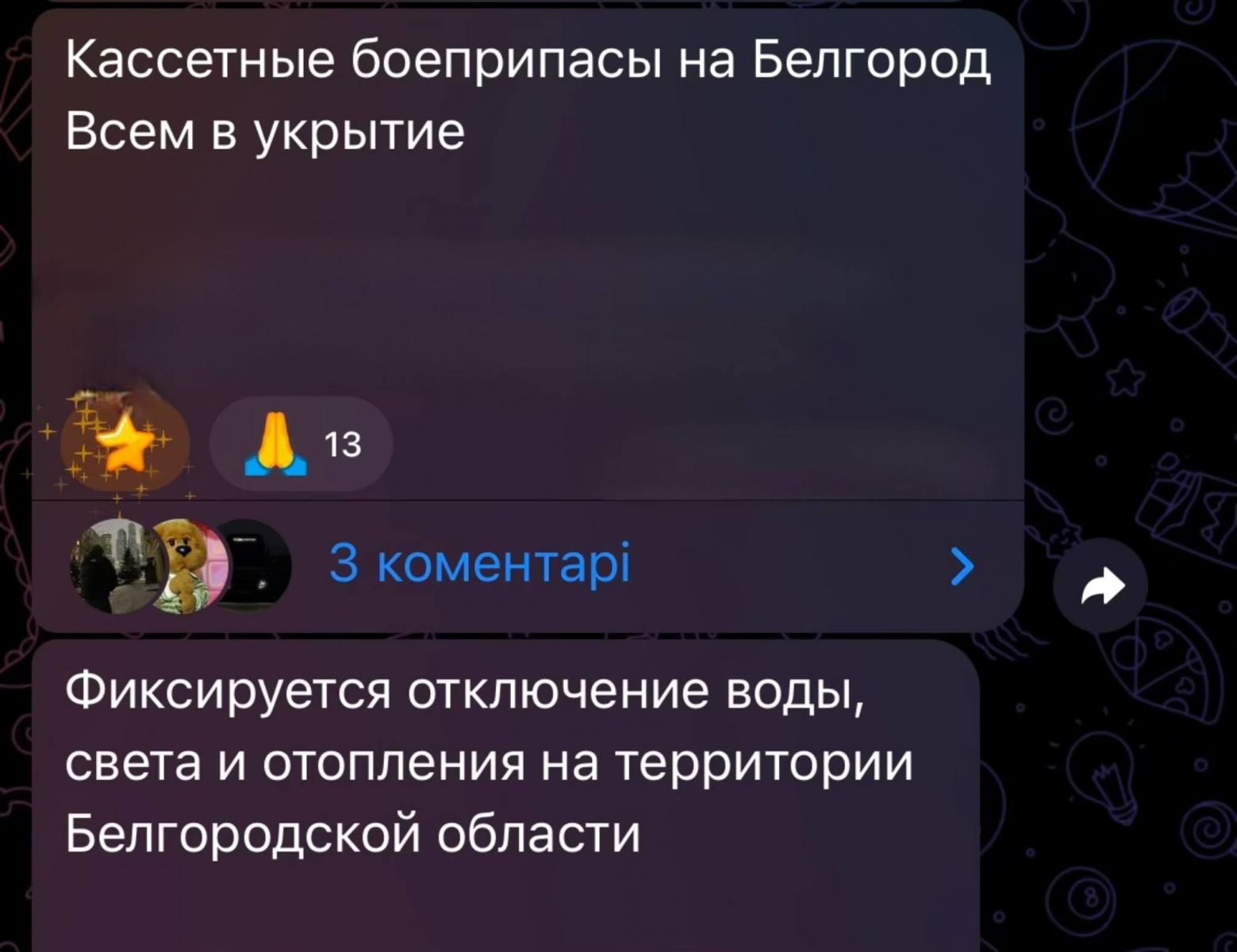 Вчора в місті прогриміла низка вибухів. Ймовірно, була атакована місцева ТЕЦ. Невдовзі після цього у деяких районах почалися перебої зі світлом та теплом. Окрім світла та тепла, у деяких районах Бєлгорода та передмістя, зникла також вода і припинило мовлення місцеве телебачення. Про це губернатор Бєлгородської області В’ячеслав Гладков та місцеві пабліки повідомили у Telegram.