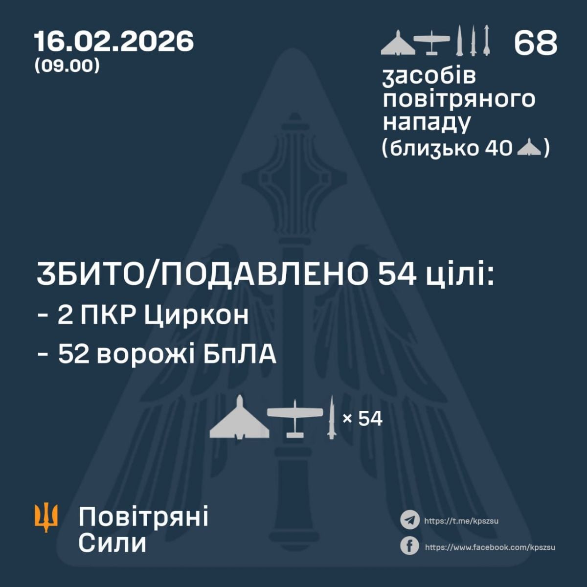 Протиповітряна оборона знешкодила дві протикорабельні ракети «Циркон» та 52 ворожі безпілотники типу Shahed, «Гербера», «Італмас» та дронів інших типів. Одна ракета та дев’ять БпЛА влучили на восьми локаціях. А уламки збитих цілей впали на двох локаціях. Ще уточняється інформація щодо трьох ворожих ракет.