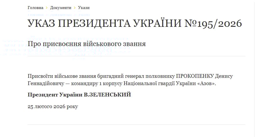 У середу, 25 лютого, президент України Володимир Зеленський присвоїв звання бригадного генерала командиру 1-го корпусу Нацгвардії «Азов» Денису «Редісу» Прокопенку. Відповідний указ № 195/2026 з’явився на сайті Офісу президента.