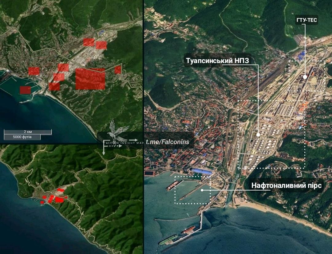 За даними супутникового моніторингу пожеж зафіксовано термальні аномалії в районах нафтоналивного пірсу, резервуарного парку для нафти та нафтопродуктів, ГТУ-ТЕС Туапсинського НПЗ.