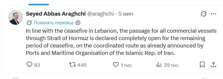 Відповідно до угоди про припинення вогню в Лівані, прохід для всіх комерційних суден через Ормузьку протоку оголошується повністю відкритим на решту періоду припинення вогню за узгодженим маршрутом, як вже було оголошено Організацією портів та мореплавства Ісламської Республіки Іран, — йдеться у повідомленні.
