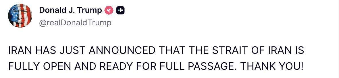 Іран щойно оголосив, що протока повністю відкрита і готова до повноцінного проходу судів. Дякую! — написав він у соцмережі.