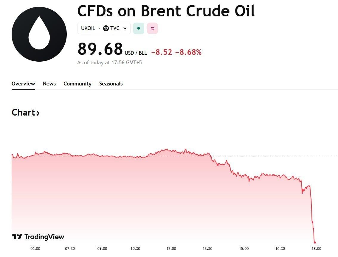 Ринок також миттєво відреагував на заяву іранської влади. Ціни на нафту різко пішли вниз. Станом на зараз нафта марки Brent коштує нижче 90 дол. за барель.