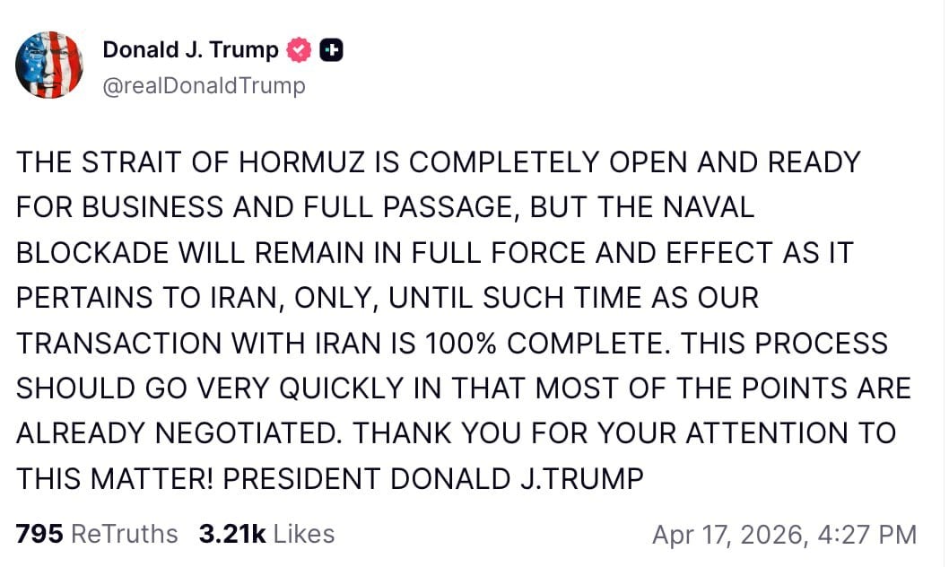Попри оголошення про відкриття Ормузької протоки для комерційних суден, американські вістка й надалі блокуватимуть усі морські перевезення з та до портів Ірану. Обмеження діятимуть доти, доки не буде укладена повна угода з Тегераном. Про це президент США Дональд Трамп написав у соціальній мережі Truth Social.