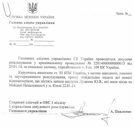 Запит надісланий у зв'язку з відкриттям кримінального провадження за статтею 109 Кримінального кодексу «Публічні заклики до насильницької зміни чи повалення конституційного ладу або до захоплення державної влади, а також розповсюдження матеріалів із закликами до вчинення таких дій».