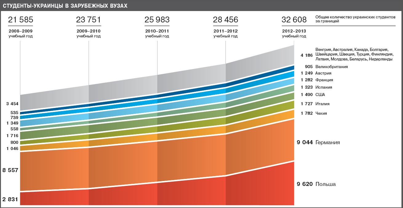 Експерти, як зазначається, не змогли зібрати дані про кількість українців, які навчалися в 2012 — 2013 навчальному році у Росії. Але інформація за кілька останніх років свідчить: популярність російських вузів спочатку зростала, а потім пішла на спад: у 2003 — 2004 роках російські дипломи отримали 3120 українців, у 2010 — 2011-му — 4919, а в 2011 — 2012 роках — 4644.