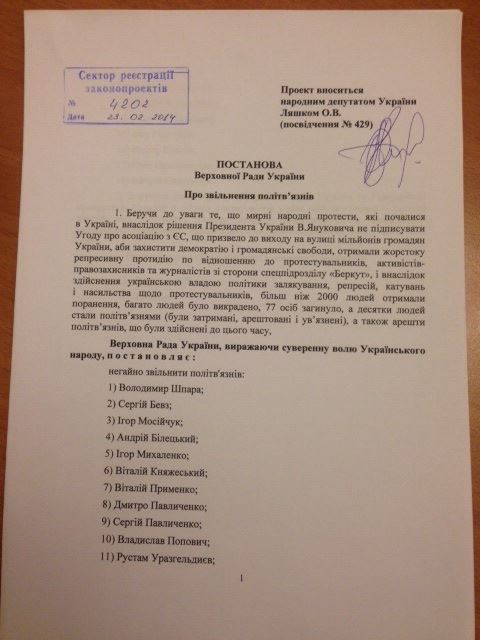 У Раді зареєстровано проект постанови про звільнення політв’язнів (ДОКУМЕНТ)