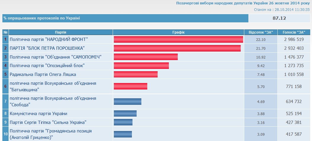 «Свобода» і КПУ не долають 5-відсотковий бар'єр у Раду, набираючи 4,69% і 3,88% відповідно.