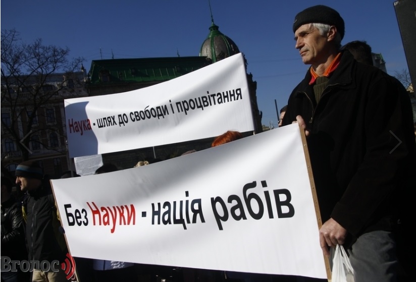 https://racurs.ua/ua/n68283-u-lvovi-naukovci-vyyshly-na-akciu-protestu-foto.htmlРакурсЯк повідомляє «Вголос», протестуючі вимагають відновлення фінансування Національної академії наук.