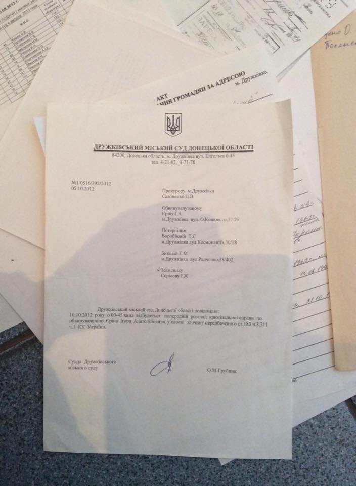 «В туалеті немає туалетного паперу, але судячи по всьому працівників суду це не сильно турбує. Замість туалетного паперу у відрі з папером — копії паспортів та ІНН, свідоцтва про реєстрацію, реєстраційні документи Дружківського міського управління юстиції, ухвали суду з мокрими печатками, кореспонденція, рахунки і багато інших документів», — написав Островський.