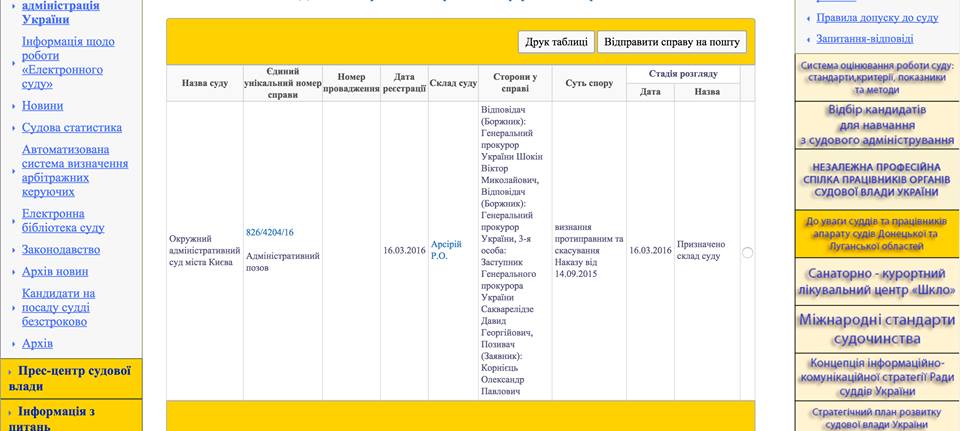 «Мені стало відомо про те, що 14.04.2016 Окружний адміністративний суд Києва розгляне позов про скасування наказу ГПУ про призначення на посаду заступника генпрокурора Сакварелідзе. Мною подано аналогічний позов 16.03.2015, однак дата засідання не визначена», — йдеться в повідомленні.
