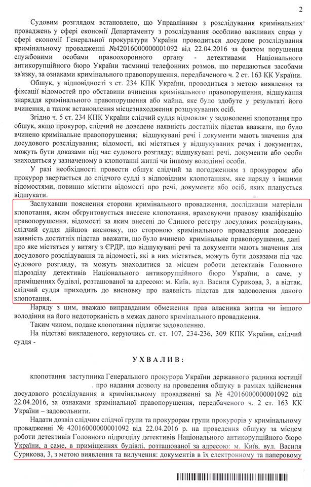 НАБУ: Постанова суду про обшук дозволяє вилучити будь-які матеріали (ДОКУМЕНТ)