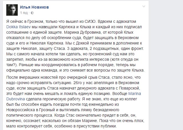 «Я зараз у Грозному, щойно вийшов з СІЗО. Удвох з адвокатом Доккою Іцлаєвим ми відвідували Карпюка та Клиха і кожен з них підписав угоду про єдиний захист», — додав Новіков.