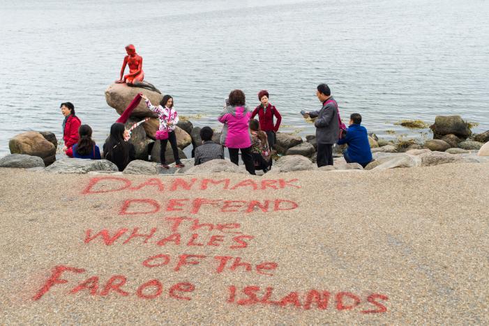 «Данія захистить дельфінів Фарерських островів», — написано по-англійськи перед статуєю червоною фарбою. Таким чином, за задумом зоозахисників, фарба на тілі Русалоньки символізує дельфінячу кров.
