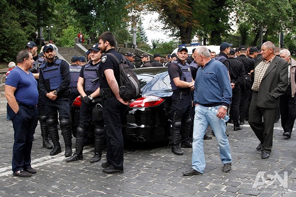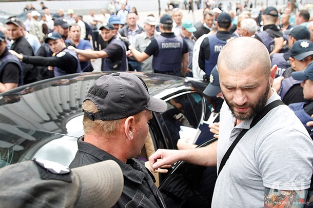 За його словами, машина переїхала ногу одному з учасників акції. Протестувальники почали кидати в автомобіль каміння. Поліція забрала одного з активістів й оточила машину.